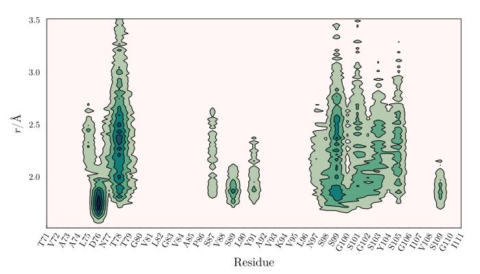 Finally, as with radial distribution functions, MDDFs can be used to compute Kirkwood-Buff integrals to connect the accumulation or depletion of the solvents components to thermodynamic properties, like protein structural stability, solubility, and others.