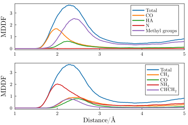 Additionally, the MDDFs can be decomposed into contributions of each type of atom (or groups of atoms) of the solute and solvent molecules, such that the profiles of the distributions can be interpreted in terms of the chemical nature of the species involved in the interactions at each distance.