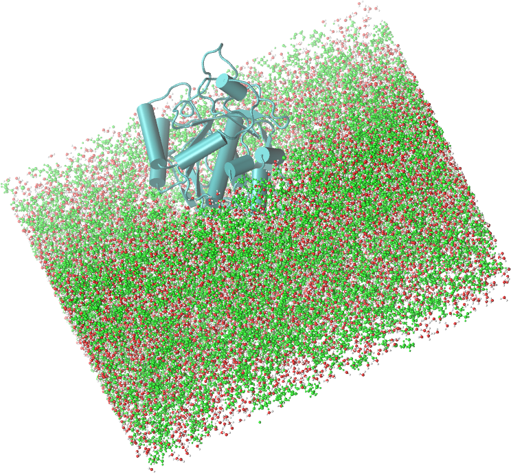 The following examples consider a system composed a protein solvated by a mixture of water and glycerol, built with Packmol. The simulations were performed with NAMD with periodic boundary conditions and a NPT ensemble at room temperature and pressure. Molecular pictures were produced with VMD and plots were produced with Julia's Plots library.