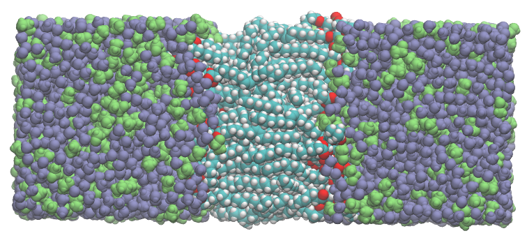 System image: a POPC membrane (center) solvated by a mixture of water (purple) and ethanol (green). The system is composed by 59 POPC, 5000 water, and 1000 ethanol molecules.
