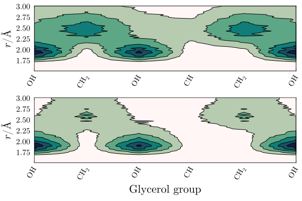 The interesting result here is that the $\mathrm{CH}$ group of glycerol is protected from both solvents. There is a strong density augmentation at the vicinity of hydroxyl groups, and the second peak of the MDDFs is clearly associated to interactions with the $\mathrm{CH_2}$ groups.