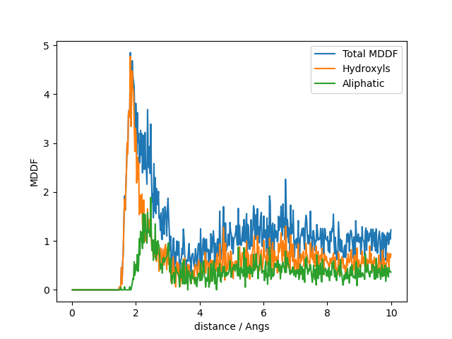 Despite the low sampling, it is clear that hydroxyl groups contribute to the greter peak of the distribution, at hydrogen-bonding distances, as expected. The contributions of the aliphatic groups to the MDDF occurs at longer distances, associated to non-specific interactions.