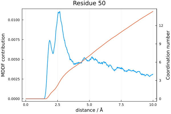 In the following example we compute the coordination number of the atoms of residue 50 (which belongs to the solute - a protein) with the solvent atoms of TMAO, as a function of the distance. The plot produced will show side by side the residue contribution to the MDDF and the corresponding coordination number.
