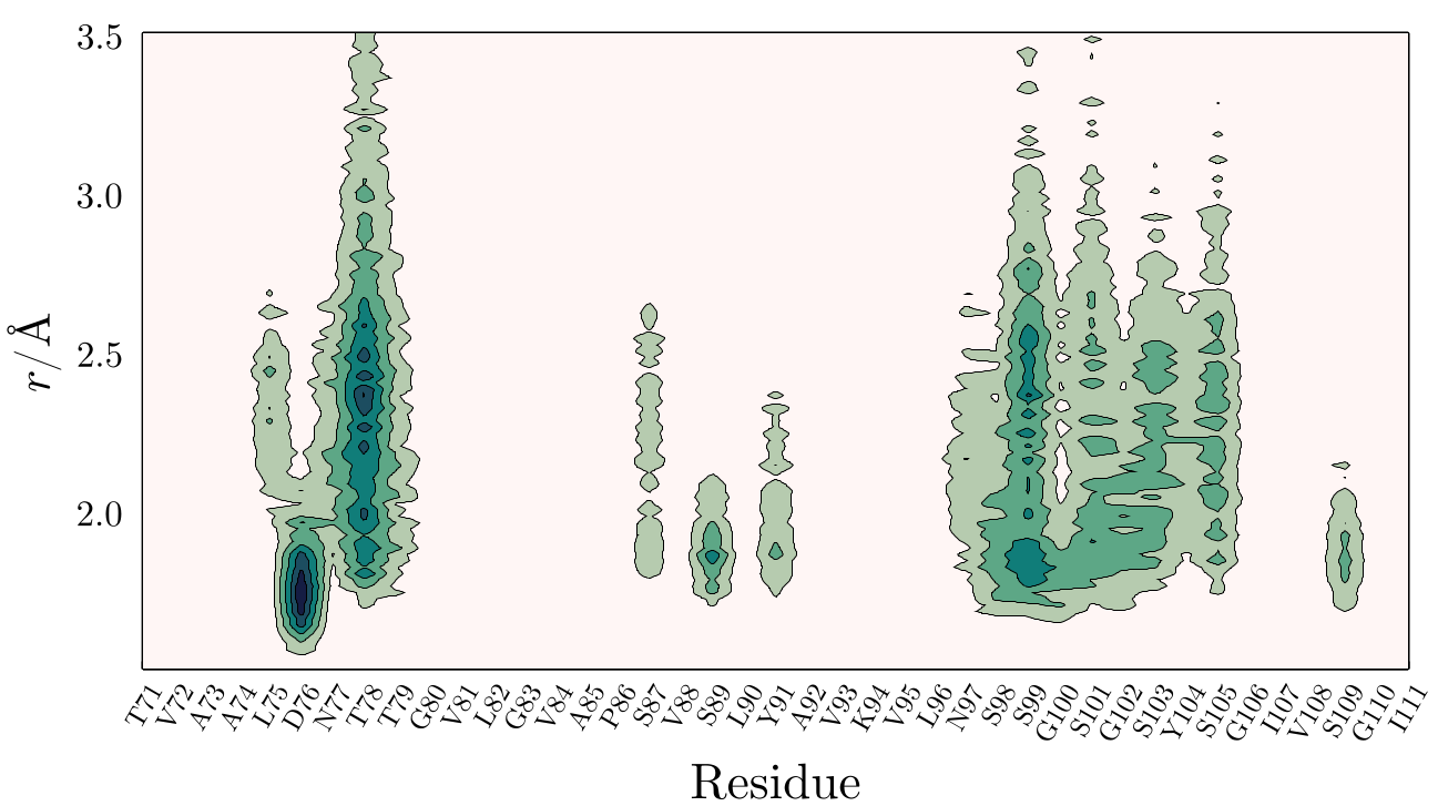 residue_range: The range of residues to plot. Default is1:1:length(eachresidue(atoms)). Use a step to plot everynresidues, e.g.,1:2:30.dmin::Real: The minimum distance to plot. Default is1.5.dmax::Real: The maximum distance to plot. Default is3.5.oneletter::Bool: Use one-letter residue codes. Default isfalse. One-letter codes are only available for the 20 standard amino acids.xlabelandylabel: Labels for the x and y axes. Default is"Residue"and"r / Å".type::Symbol: That data to plot. Default is:mddffor MDDF contributions. Options are:coordination_number, and:mddf_count.clims: The color limits for the contour plot.