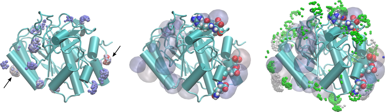 Clicking on those points we obtain which are the atoms of the protein contributing to the MDDF at that region. In particular, the arrow on the right points to the strongest red region, which corresponds to an Aspartic acid. These residues are shown explicitly under the density (represented as a transparent surface) on the figure in the center.